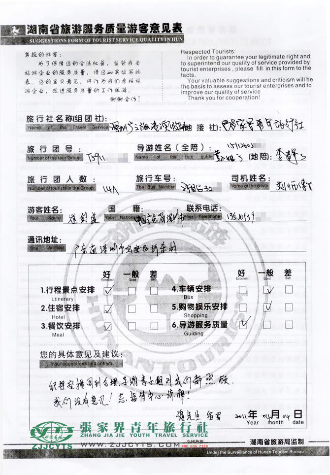鳴謝“深圳廣之旅港澳假期”-吳總,所給予的合作機(jī)會,同時也感謝崔先生一行選擇張家界青年旅行社及對我社安排的配合與支持。我們會繼續(xù)努力做好旅游接待工作。期待諸位朋友們再次做客美麗的張家界,來到美麗的小城-鳳凰古城,祝一切順利!客服--“卓東來”留言。2011-04-08
